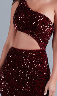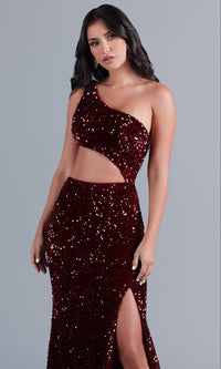 In deep dark red, this long sequin prom dress is as dazzling as it is sexy. Exclusively found at PromGirl, this long designer dress features allover sequins from the one-shoulder bodice to the hem of the long skirt. A side cut-out wraps around to the back of this fabulous long sequin evening gown for a flirty look at prom, fancy military balls, and other formal events. Offered in misses and plus sizes, this long sequin formal dress includes a hip-hugging long skirt that opens in a side slit before flowing down to the floor. As glamorous as it is figure flattering, this seductive long sequin prom dress is ready to catch the spotlight on your big night.