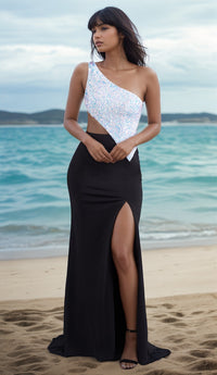 Bold and beautiful, this black and white long prom dress is a designers dream. A modern style, this one-shoulder formal dress is sold exclusively at PromGirl for a glamorous look at prom, military balls, and other black-tie events. The sparkly evening gown features a fully-sequined one-shoulder bodice with asymmetrical neckline and side cut out that wraps around to the back. The sequined white bodice creates a beautiful contrast as it attaches to the black floor-length skirt that smooths over the hips before opening in a side slit. Offered in misses and plus sizes, this black and white long prom dress is as modern as it is polished posh.