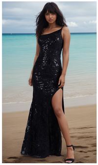 This long black sequin prom dress is a real dazzler for your very special event. Whether you're attending prom, a military ball, or another formal event, this long black designer dress has a sequin design that shines from the asymmetrical neckline to the hem. With a one-shoulder bodice, this beautiful long black evening gown smooths over the hips before opening in a thigh-high slit that adds a sexy vibe. Sold exclusively at PromGirl, this shimmering long black sequin prom dress is offered in misses and plus sizes.