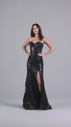 Here's a long black strapless prom dress that is as sparkly as it is seductive. With a sheer corset-style bodice, this gorgeous long black designer dress shimmers with sweeping sequin designs from the sweetheart neckline to the floor. The strapless sequin formal dress includes a fully-lined long skirt with a sequin sheer overlay that opens in a side slit for a flirty look at prom, black-tie formals, and other very special occasions. Sold exclusively at PromGirl, this elegant long black strapless sequin prom dress is offered in misses and plus sizes.