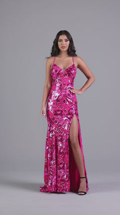 Totally unique, this bright long sequin prom dress is as exotic as it is dazzling. Sold exclusively at PromGirl, this gorgeous long designer gown has sparkly sequin patterns from the v-neckline to the floor for an eye-catching look at prom, fancy galas, and other formal events. Offered in misses and plus sizes, this elegant formal dress has thin shoulder straps that shimmer as they criss-cross the open back. A bold and beautiful choice for your formal event, this bright long sequin prom dress has a curve-hugging long skirt that opens in a side slit to complete the radiant look.