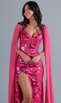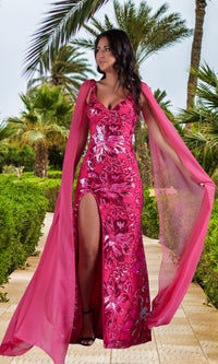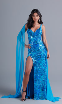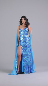 So glamorous, this long sequin prom dress has sheer shoulder capes that gracefully trail behind with your every step. Fun and fancy for prom, formals, and other fancy special occasions, this long designer dress has sparkly sequin patterns from the v-neckline to the hem of the long skirt. The long formal dress has supportive shoulder straps that lead to the deep v-back, while the figure-flattering long sequin skirt opens in a side slit to reveal a flirty look. Sold exclusively at PromGirl, this elegant long sequin prom dress is offered in misses and plus sizes.