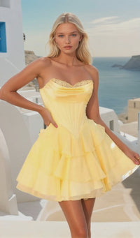 Party chic, this strapless short homecoming dress is a gorgeous PromGirl exclusive for the upcoming hoco season. Hugged by figure-flattering pleats, the sweetheart neckline on this fit-and-flare homecoming dress has lace embroidery that's a work of art. The boned corset bodice fully supports the strapless design and beautifully contrasts with the fun and flirty flared a-line skirt that billows out in multiple stunning tiers. For a one-of-a-kind look designed by PromGirl, wear this tiered corset homecoming dress to your next school dance.