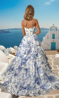 Simply sensational, this blue floral-print prom ball gown is exclusively sold at PromGirl. A trendy twist on a vintage look for prom, galas, and other formal events, this strapless a-line prom dress boasts a beautiful blue floral print that flows over an ivory background from the structured corset to the hem of each ruffled tier of the poofy skirt. The corset bodice of this ruffled prom ball gown features a blue lace-embroidered sweetheart neckline peaking out from a few curved horizontal pleats that draw the eyes and flatter the curves. Whimsical and full of flirty movement, the fluffy ball-gown-style skirt features numerous ruffled tiers and parts in a thigh-high side slit that makes it easy to dance in this corset prom dress. Offered in misses and some plus sizes, this blue floral-print prom ball gown is sure to bring your romantic visions to life for your very special formal event.
