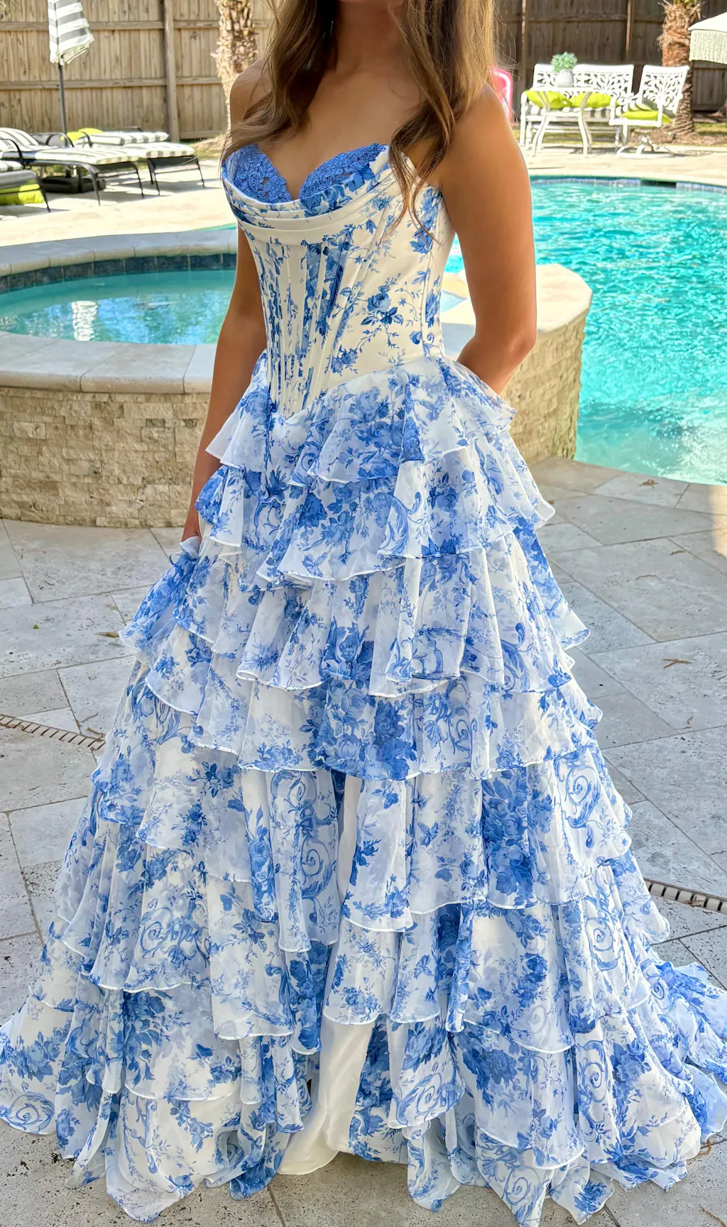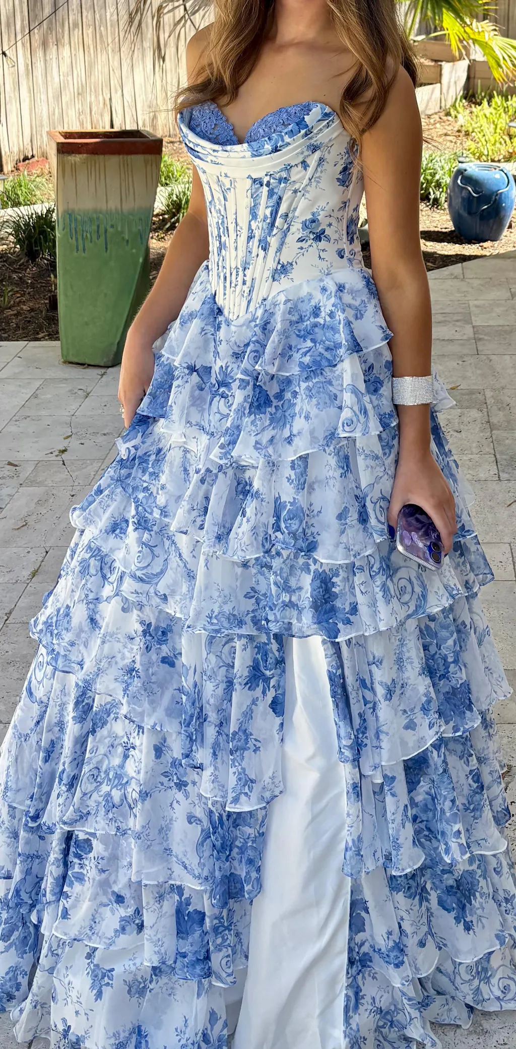 Simply sensational, this blue floral-print prom ball gown is exclusively sold at PromGirl. A trendy twist on a vintage look for prom, galas, and other formal events, this strapless a-line prom dress boasts a beautiful blue floral print that flows over an ivory background from the structured corset to the hem of each ruffled tier of the poofy skirt. The corset bodice of this ruffled prom ball gown features a blue lace-embroidered sweetheart neckline peaking out from a few curved horizontal pleats that draw the eyes and flatter the curves. Whimsical and full of flirty movement, the fluffy ball-gown-style skirt features numerous ruffled tiers and parts in a thigh-high side slit that makes it easy to dance in this corset prom dress. Offered in misses and some plus sizes, this blue floral-print prom ball gown is sure to bring your romantic visions to life for your very special formal event.