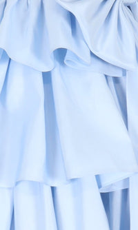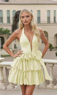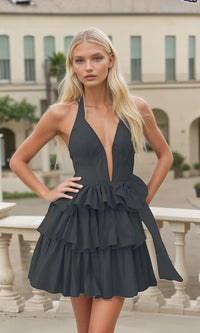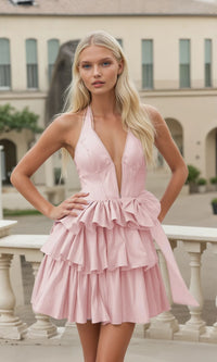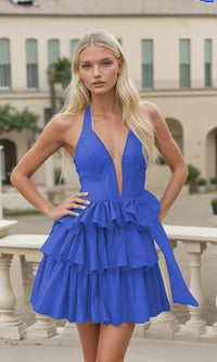 Here's a ruffled tiered short homecoming dress, exclusively sold at PromGirl, that's trending for this year's hoco celebrations. The fitted structured bodice of this fit-and-flare homecoming dress provides a figure-flattering contrast to the tiered a-line ruffled skirt. A sheer inset supports the plunging v-neckline of this halter homecoming dress, and a bow beautifully accents the side of the waistline and drapes down the tiered skirt. Be on trend when you arrive at your school dance wearing this PromGirl Exclusive v-neck ruffled homecoming dress.