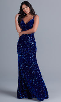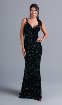 Here's an elegant long velvet prom dress that is simply dazzling. The glamorous long formal dress has allover sequins that offer an opulent look whether you are attending prom, a fancy formal, or another black-tie event. The sequin evening gown includes a v-neck bodice with thin shoulder straps that double before crossing over the open back. Offered in misses and plus sizes, this sequin long velvet prom dress is as figure-flattering as it is sparkly.