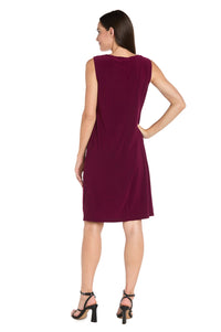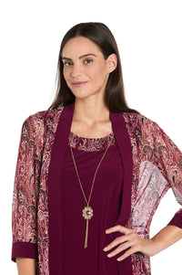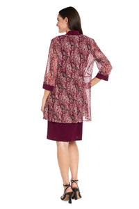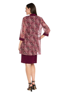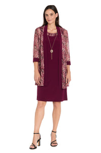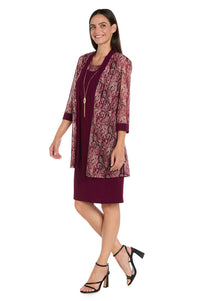 For two looks in one, slip into this petite short wine red jacket party dress by R&M Richards. The two-piece short wine red semi-formal dress features a lightweight three-quarter-sleeve mesh jacket with a beautiful paisley print woven with subtle metallic thread for a shimmery look. Underneath, the solid tank dress offers a sleek silhouette with a matching paisley print at the scoop neckline. The petite wine red cocktail dress has a coordinating necklace that pairs perfectly with this petite knee-length cocktail dress, while the skirt ends in a modest knee length. A go-to two-piece style for weddings, holiday gatherings, and other semi-formal events, this petite short wine red jacket party dress is perfect for anytime you want to shine.