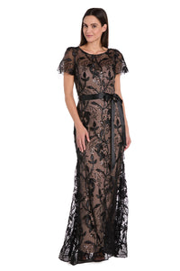 Check out this petite short sleeve long black formal dress by R&M Richards. With a sleeveless nude underlay, this fabulous long special-occasion dress has a sheer embroidered overlay that sparkles from the scoop neckline to the floor. The petite long black evening gown has sheer short sleeves for delicate coverage and a black satin sash that ties at the waist. The long a-line skirt completes the look of this petite short sleeve long black formal dress that is perfect for upscale weddings, special-occasion dances, and other black-tie events.