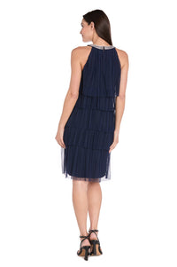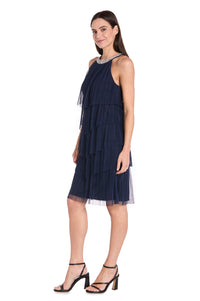 From R&M Richards, this short navy blue tiered cocktail dress has just the right amount of sparkle. With a dazzling high-neck rhinestone collar that wraps around to the back, this short blue party dress gets a touch of sparkle and elegance for weddings, cocktail parties, and other semi-formal events. Playful five-layer chiffon ruffles start at the dazzling collar of this short blue semi formal dress, and make their way down to the knees for a modest, yet fun look. Surprisingly affordable, at under $150, this short navy blue tiered cocktail dress offers an upscale look without the boutique prices.