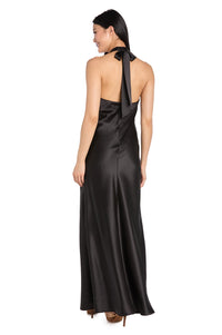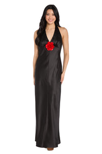 Wow the crowd in this sleek and sensual long black satin halter formal dress by R&M Richards. Designed to make an unforgettable impression, this long black evening gown is crafted in gleaming satin from the v-neck halter bodice to the hem of the long skirt. At the back of this long black satin special-occasion dress, delicate ties wrap around the neck into a soft, flowing bow that is perfectly centered by a bold red flower at the base of the neckline. A timeless style with a romantic twist, this long black satin halter formal dress is perfect for upscale weddings, galas, and any black-tie event that calls for show-stopping sophistication.