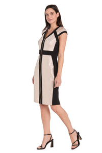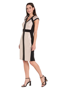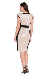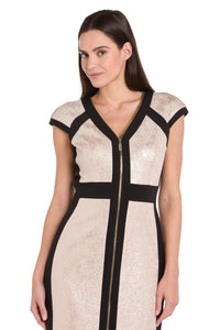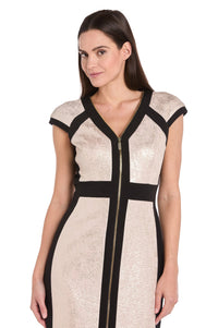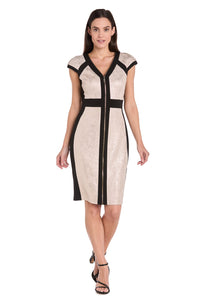 Glamour meets attitude with this knee-length champagne party dress by R&M Richards. A popular edge style, this short champagne semi-formal dress has black borders from the v-neck bodice to the hem for a shape-sculpting look. A striking full-length zipper runs straight down the center of this stylish short cocktail dress, while cap sleeves have matching black trim. A classy choice for cocktail parties, date nights out and office boardrooms, this knee-length champagne party dress is the perfect day-to-night style for the modern woman.