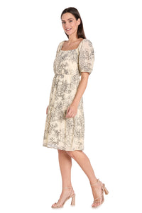 If you're looking for a light and breezy short sleeve knee-length party dress in petite sizes, this one from R&M Richards is perfect for springtime. The petite size ivory casual dress is crafted in lightweight linen fabric with a sweet black floral print from the square neckline to the hem, while short puff sleeves end with subtle elastic for a comfortable, yet romantic touch. The petite print day dress has a classic silhouette with an empire waist that tops the knee-length skirt. A sweet choice for showers, birthday parties, and other casual to semi-formal events, this short sleeve knee-length petite party dress brings effortless charm to your warm-weather wardrobe.