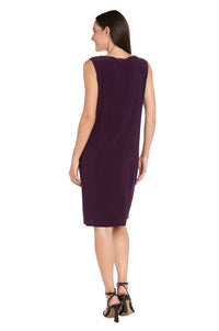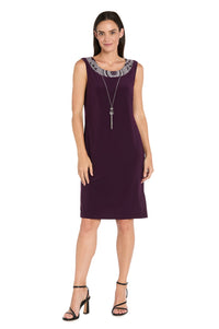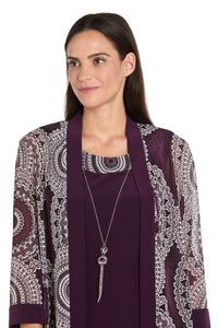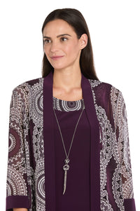 In striking eggplant purple, this petite knee-length jacket party dress is two dresses in one. In petite sizes, this fabulous short purple cocktail dress features a shift dress that looks great on all body types, while a swirling print dominates the scoop neckline. The two-piece eggplant cocktail dress set includes a lightweight three-quarter-sleeve mesh jacket with a matching print and three-quarter sleeves that provide coverage for weddings, after-work dinner parties, and other semi-formal events. A matching necklace completes the look of this two-piece petite knee-length jacket party dress that is affordably priced under $100 for a look that offers options for the busy socialite.