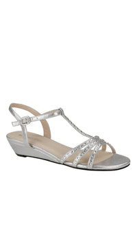 Silver short 1 inch wedge prom shoes with rhinestone details by Touch Ups.
