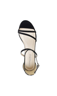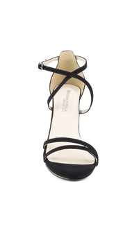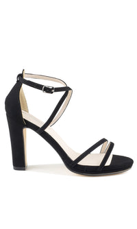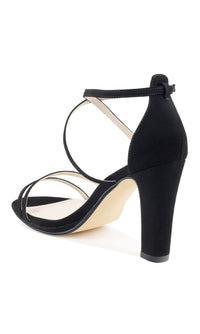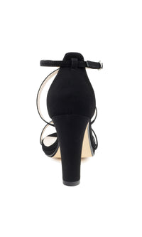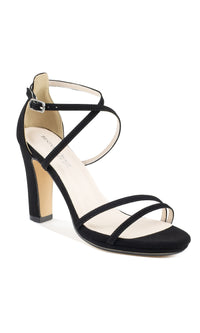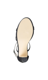 Black open-toe formal prom dress shoes with 3-inch high heels and buckle closures.