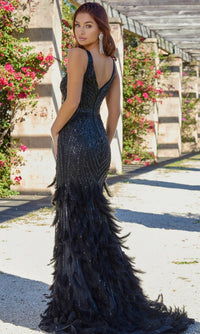 A head-to-toe stunner, this long black beaded pageant dress, Biltmore, is sure to transform you into the heroine of your own story. With sparkly beaded designs from the plunging v-neckline to the hem, this elegant long black designer dress from Velvi is ready for the spotlight at pageants, prom, and other black-tie events. The beautiful long beaded designer dress has thin shoulder straps that lead to the deep v-back, while the hip-skimming long skirt gets a style upgrade with soft feathers from the thigh-high side slit to the floor that add movement with every twirl. For the girl who knows she deserves the crown, this long black beaded prom dress from Velvi is a captivating choice that is sure to create beautiful memories.
