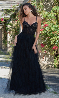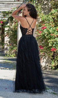 Celebrate your special evening in this gorgeous long mulberry purple prom dress named Dahlia. From Velvi, this beautiful long designer dress is a one-of-a-kind style with a sheer lace bodice that wraps around to the lace-up open back. In misses and some plus sizes, this long mulberry purple formal dress has a long skirt with vertical ruffles that flow down to the floor in a flattering a-line shape. So pretty for prom, galas, and military balls, this long mulberry purple prom dress is ready to make beautiful memories.
