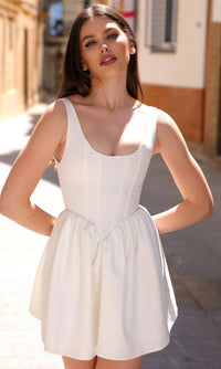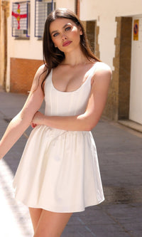 So adorable, this a-line mini graduation party dress named Darling is as sweet as can be. With a scoop-neck corset-style sleeveless bodice, this short semi-formal dress has supportive shoulder straps that lead to the matching scoop back for a fitted look at graduation, homecoming, and cruises. Offered in misses and some plus sizes, this short cocktail dress has a basque waistline that tops the mini skirt that flows to the hem in a figure-flattering a-line skirt. Affordably priced under $100, this short a-line graduation party dress from Velvi is one that you don't want to miss.