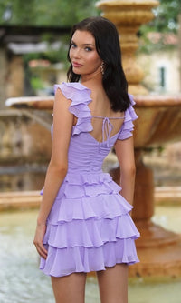 Ruffles, ruffles everywhere, on this sweet short homecoming dress named Nora. So cute, this v-neck short party dress has ruffled cap sleeves and a short a-line skirt with matching ruffled tiers. A surplice v-neckline adds an alluring vibe to this ruffled cocktail dress, while a banded empire waist creates a long and lean look for homecoming, sweet-16 parties, and other semi-formal events. An adjustable back tie completes the look of this budget-friendly short homecoming dress that is surprisingly under $150.