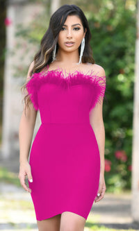 Here's a pretty short strapless party dress that is sure to stand out in a crowd. The short party dress features a strapless bodice with fancy feathered trim that wraps around to the back for a captivating look at graduations, wedding receptions, and other semi-formal events. Smoothing over the curves from the feathered neckline to the hem, this strapless mini dress provides a fabulous silhouette as you strike an elegant pose. Flirty and fun, this short strapless party dress offers a sophisticated look with fun details.