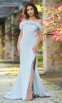 Here's a feather-trimmed strapless long prom dress that is so gorgeous it has a name. Sochi is the name of this beautiful long designer dress by Velvi that hugs the curves from the feathered neckline to the floor for a fabulous silhouette at prom, galas, and other red-carpet events. In misses and some plus sizes, this long formal dress has a floor-length skirt that hugs the hips while a wide side slit adds a sexy vibe. An eye-catching choice for your big formal, this feather-trimmed strapless long prom dress is sure to get endless compliments when you make your exciting entrance.